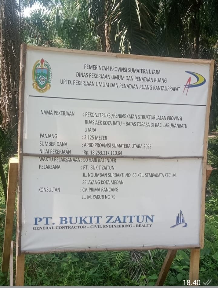 Nama Pekerjaan : Rekonstruksi/ Peningkatan Struktur Jalan Provinsi Ruas Jalan Aek Kota Batu – Batas Tobasa Kabupaten Labuhanbatu Utara, Sumatera Utara sampai kini masih terus menjadi sorotan publik.