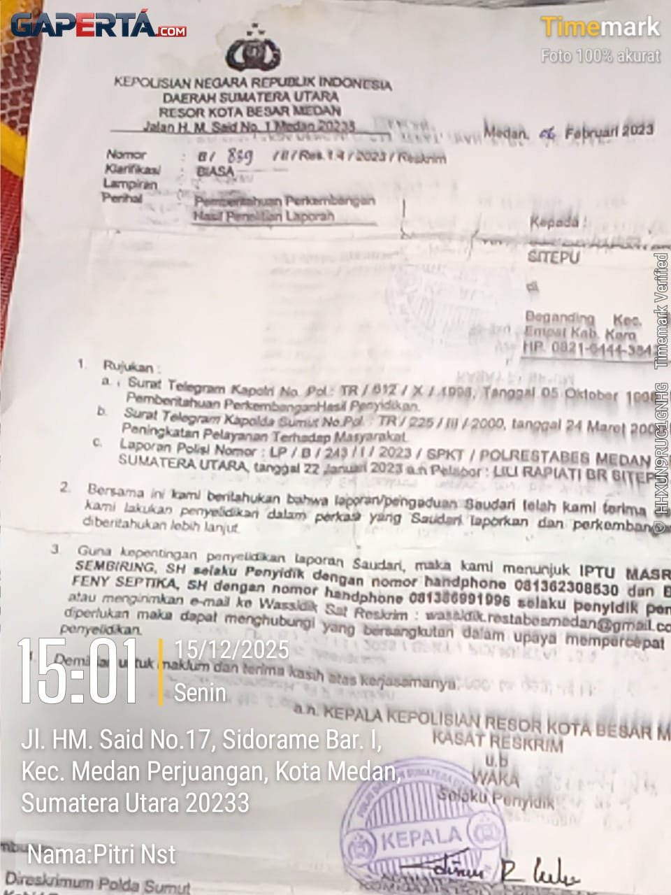 Redaksi Gaperta.com memohon dengan sangat agar SubBid Paminal Polda Sumatera Utara segera turun tangan memberikan atensi khusus atas laporan yang mandek selama dua tahun ini.