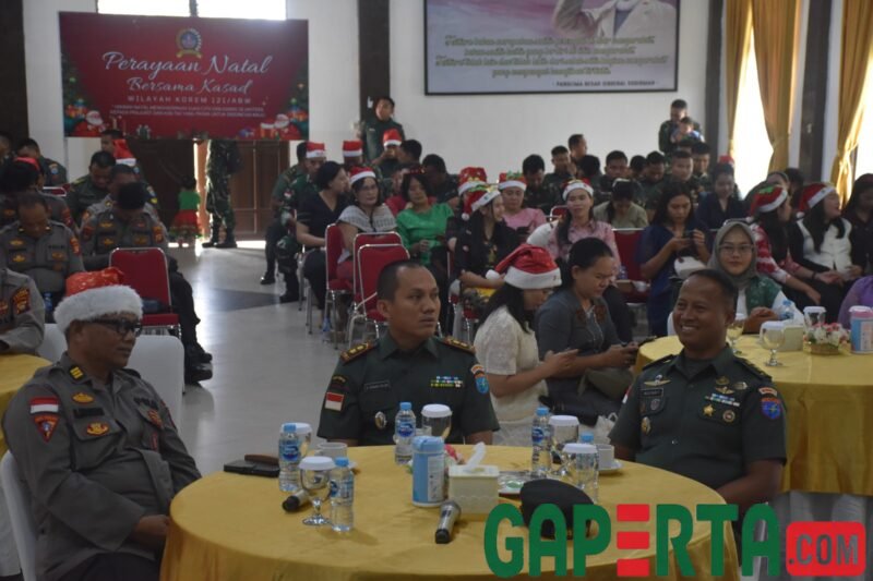 Kasipers Kasrem 121/Abw Letkol Arh Agus Nur Fujianto, S.I.P., M.Han., mewakili Danrem 121/Abw Brigjen TNI Purnomosidi, S.I.P., M.A.P., M.Han., menghadiri acara Perayaan Natal bersama Kepala Staf Angkatan Darat (Kasad) yang dilaksanakan secara daring, bertempat di Aula Kodim 1205/Stg, Sintang, Kalimantan Barat, Senin (12/01/2026).