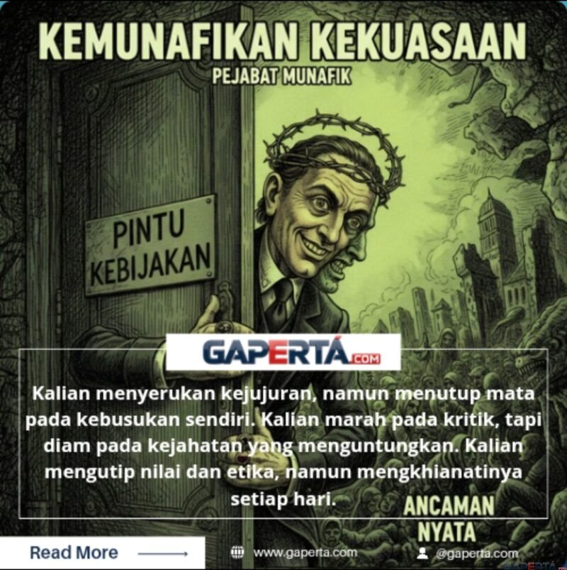 Inilah wajah kemunafikan: berpura-pura membela rakyat, sambil menghisap darahnya perlahan. Rakyat tidak bodoh. Kami melihat, kami mencatat, dan kami tidak akan lupa. Karena pejabat munafik adalah racun bagi negeri ini.